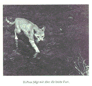Ti-Puss crossing a ford when on a walk together with Ella Maillart.